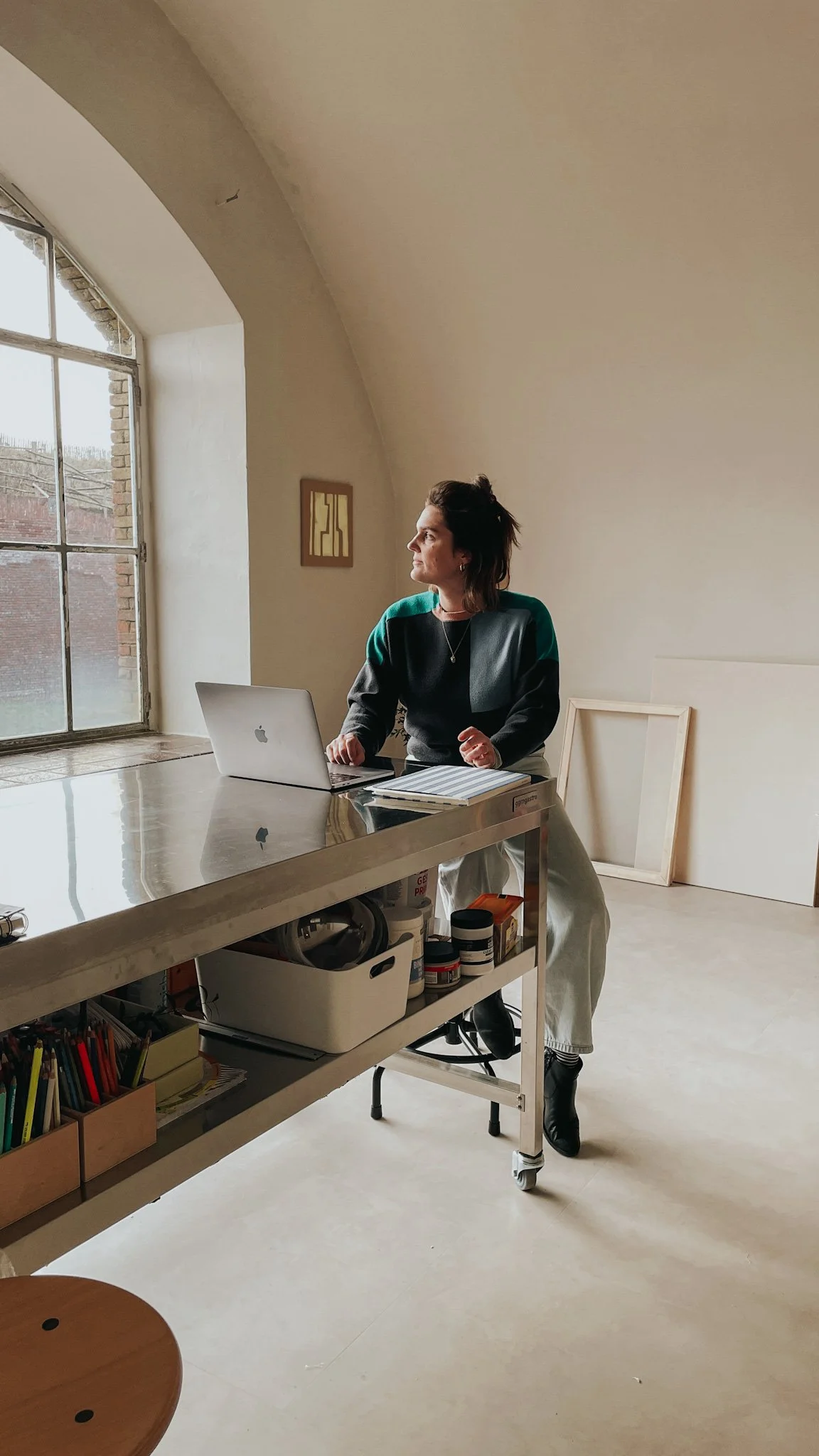 Het werd een fantastische ruimte in de Citadel van Diest, een oude legerkazerne die een (tijdelijke) invulling kreeg door (creatieve) ondernemers. Ik werd op slag verliefd op het oversized atelierraam, waardoor de studio rijkelijk voorzien wordt van prachtig daglicht. Het is omgeven door bos én citylife, wat het een zeer bereikbare en bijzondere plek maakt.